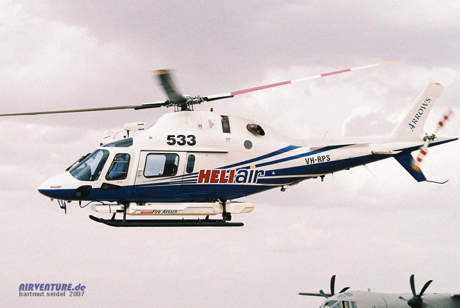 Dieser leichte Mehrzweckhubschrauber vom italienischen Typ Agusta A 119 Koala der australischen Firma Heli Air ist mit einem 1.200 Liter Wasser fassenden "Simplex Fire Attack" Feuerlöschsystem unter dem Rumpf ebenfalls für die Bekämpfung von Buschfeuern ausgerüstet. Der Agusta Koala war während der Trade Days der Australian International Airshow 2007 im Static Display zu sehen und startet hier gerade zum Heimflug. |