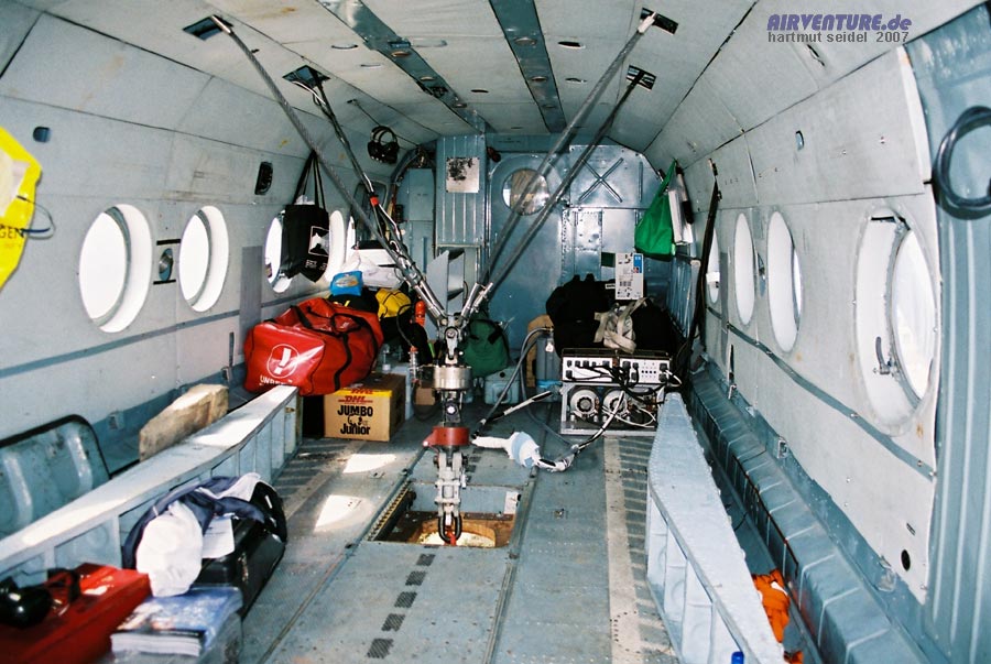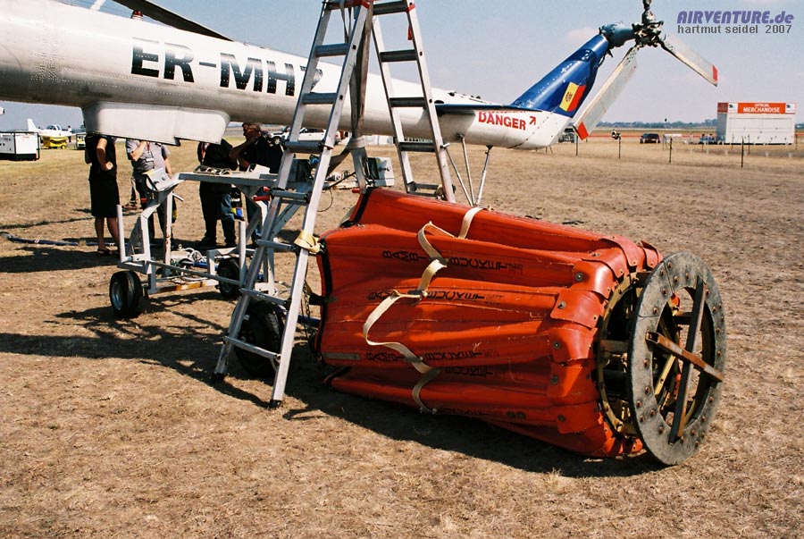 Die Aussenlast-Tragvorrichtung des "Bambi Bucket"-Löschbehälters ist nicht an einem Lasthaken unter dem Rumpf des Mi-8 angebracht, sondern befindet sich im Frachtraum des Hubschraubers, wo sie mit vier starken Tragseilen am Kabinendach befestigt ist und durch eine Öffnung im Rumpfboden nach aussen reicht. |