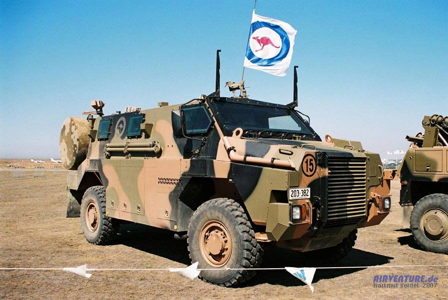 Im Rahmen der Australian International Airshow 2007 wurden auf dem Airshowgelände auf dem Avalon Airport auch etliche interessante Fahrzeuge der australischen Streitkräfte ausgestellt. Dieses Foto zeigt ein in Australien entwickeltes gepanzertes Mannschaftstransportfahrzeug ( Infantry Mobility Vehicle ) vom Typ "Bushmaster". |