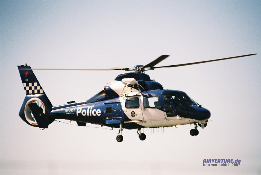 Auch dieser Mehrzweckhubschrauber vom Typ Eurocopter AS. 365 N 3 Dauphin von der Victoria Police Air Wing befindet sich gerade im Anflug auf den Airshow-Heliport. |
