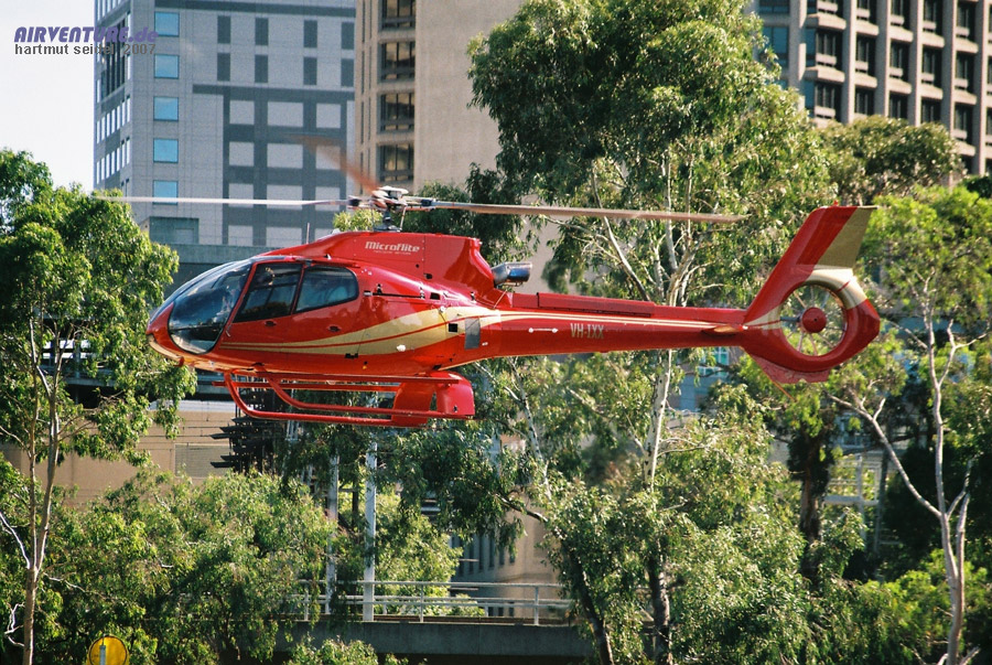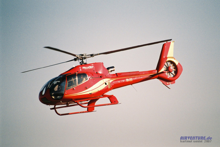 Hier verlässt gerade ein Eurocopter EC 130 von Microflite Helicopter Services mit Passagieren an Bord den Airshow-Heliport am Haupteingang zur Australian International Airshow 2007. |