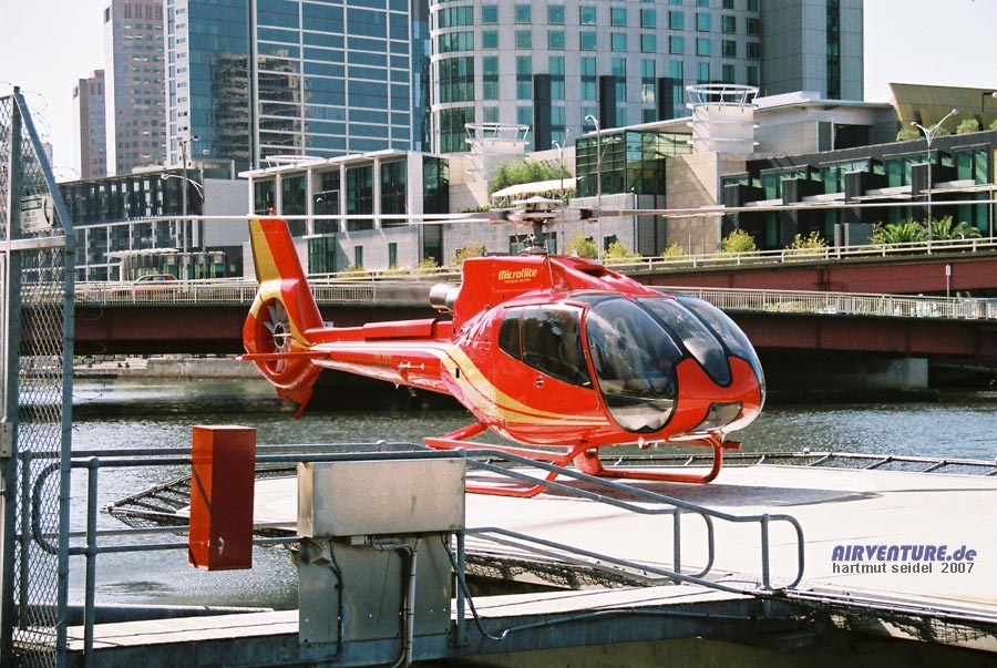 Der bereits im oberen Foto gezeigte Eurocopter EC 130 mit dem Kennzeichen VH-IXX war nicht nur im Rahmen der Airshow auf dem Avalon Airport im Einsatz. Zwei Tage vor dem Beginn der Australian International Airshow 2007, am Sonntag dem 18. März, konnte man diesen EC 130 etliche Male wie hier auf dem Melbourne City Helipad starten und landen sehen, von dem aus mit ihm vermutlich Shuttleflüge zum an diesem Tag stattfindenen "Formula 1 Australian Grand Prix" Autorennen durchgeführt wurden. |