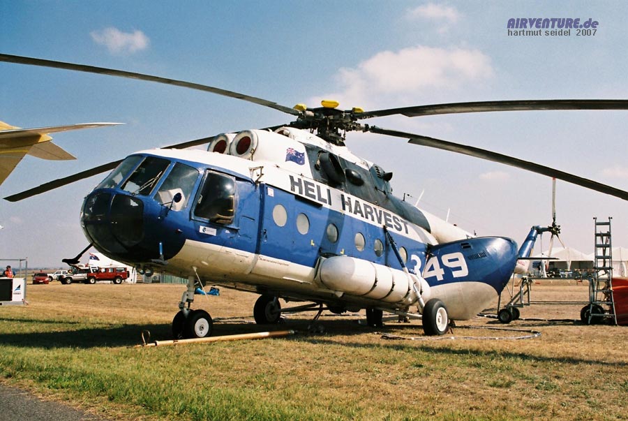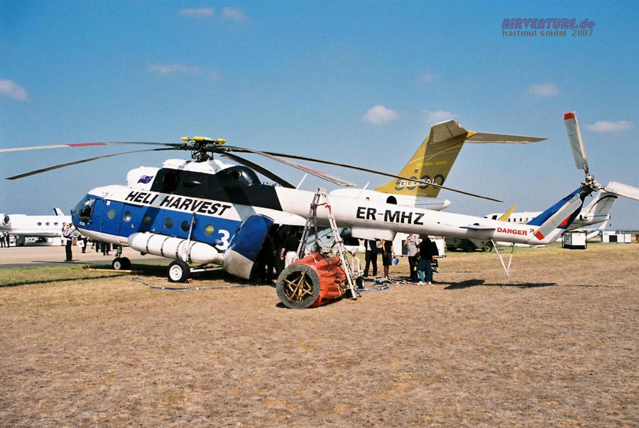 Der Mil Mi-8 hat ein Zivilluftfahrtkennzeichen aus Moldawien ( ER-MHZ ) und ist normalerweise in Taupo / Neuseeland stationiert, wo er von der neuseeländischen Firma Heli Harvest für eine Vielzahl von verschiedenen Aufgaben verwendet wird. Seit Dezember 2006 befindet sich dieser Mi-8 in Australien, wo er von Heli Harvest im Auftrag der australischen Behörden für die Bekämpfung von Buschfeuern eingesetzt wird. |