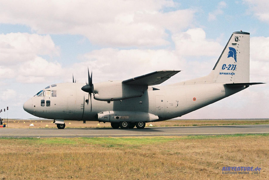 Auf der im Flugprogramm der Australian International Airshow 2007 gezeigten Alenia C-27 J Spartan befindet sich ganz oben auf der Seitenflosse das kleine schwarz-weiße Wappen der "Reparto Sperimentale Volo", des Flugtestzentrums der italienischen Luftstreitkräfte. Mit der C-27 J Spartan wurden übrigens nicht nur eindrucksvolle Solo-Flugvorführungen gezeigt. Die C-27 J wurde im Rahmen der Airshow auch als Absetzmaschine für Massenabsprünge von Fallschirmspringern genutzt. |