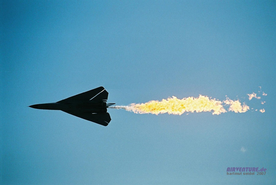 Das bereits bei Tageslicht ausserordentlich spektakuläre "dump-and-burn"-Manöver der General Dynamics F-111 der Royal Australian Air Force wurde im Rahmen der "Boeing Friday Night Alight"-Nachtairshow auch nach Einbruch der Dunkelheit gezeigt. Beim "dump-and-burn"-Manöver wird Treibstoff in die heißen Triebwerksabgase der F-111 abgelassen, was einen etwa 30 Meter langen Feuerschweif hinter der Maschine erzeugt. |