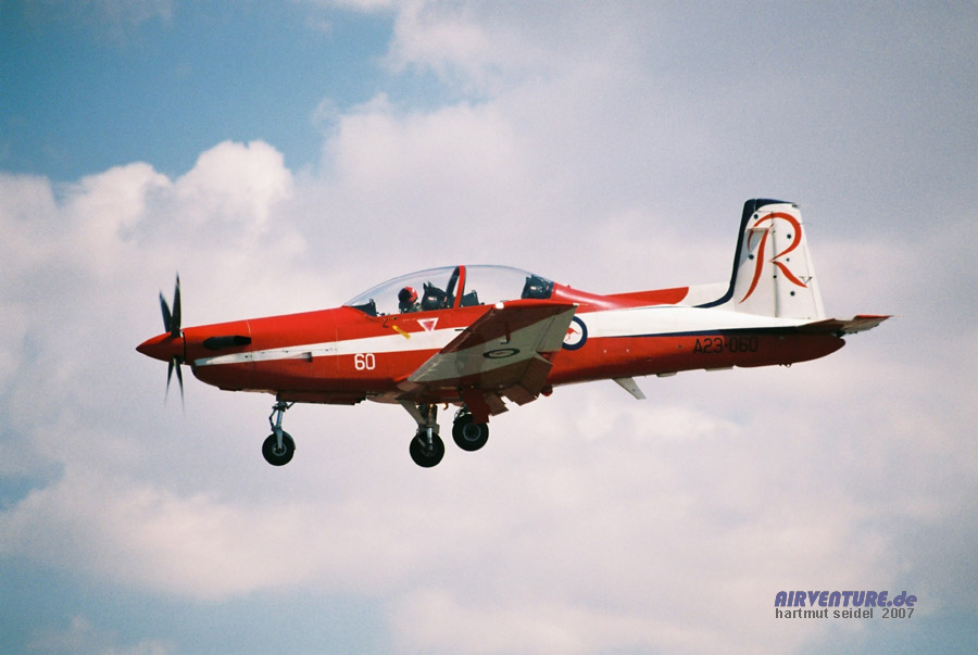 Im Flying Display der Australian International Airshow 2007 hat auch wieder das Royal Australian Air Force Aerobatic Display Team "Roulettes" eindrucksvolle Formationskunstflugvorführungen mit sechs Maschinen vom Typ Pilatus PC-9 gezeigt. |