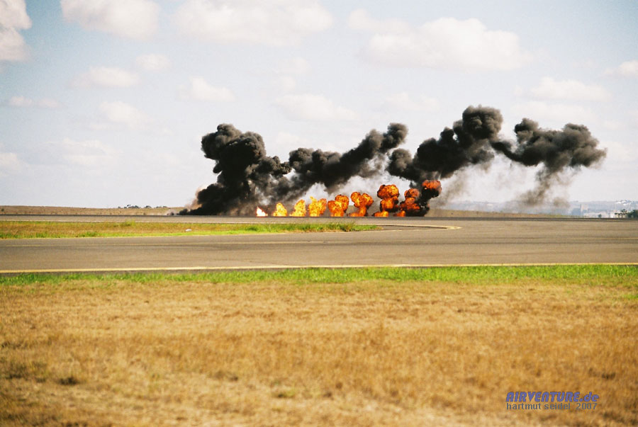 Am Freitag, dem 23. März 2007 wurde dem Publikum der Australian International Airshow 2007 auch wieder ein sehr eindrucksvolles "Boeing Friday Night Alight"-Nachtairshowprogramm geboten, welches neben eindrucksvollen Flugvorführungen ebenfalls wieder viele pyrotechnische Spezialeffekte enthielt, darunter zum krönenden Abschluß die gewaltige "Wall of Fire". |