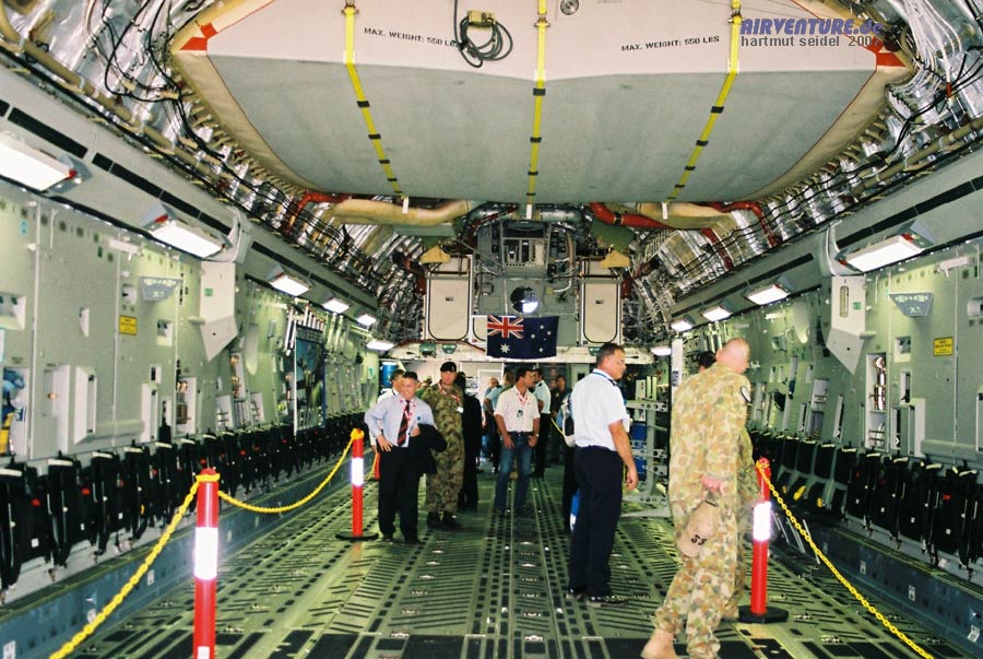 Dem interessierten Publikum der Australian International Airshow 2007 war es auch erlaubt, sich den 26,82 Meter langen und 5,49 Meter breiten und über 4 Meter hohen Frachtraum der Boeing C-17 Globemaster III auch von innen anzusehen. Die maximale Frachtzuladung ( Nutzlast ) der C-17 beträgt etwa 75 Tonnen. |