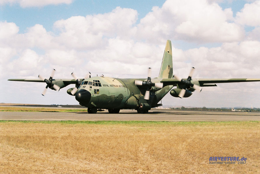 Während vor zwei Jahren bei der Australian International Airshow 2005 eine von den neuen Lockheed C-130 J Hercules der RAAF im Flug vorgeführt wurde, war nun in diesem Jahr an einigen Tagen der Australian International Airshow 2007 diese ältere Hercules der Version Lockheed C-130 H im Flugprogramm zu sehen. |