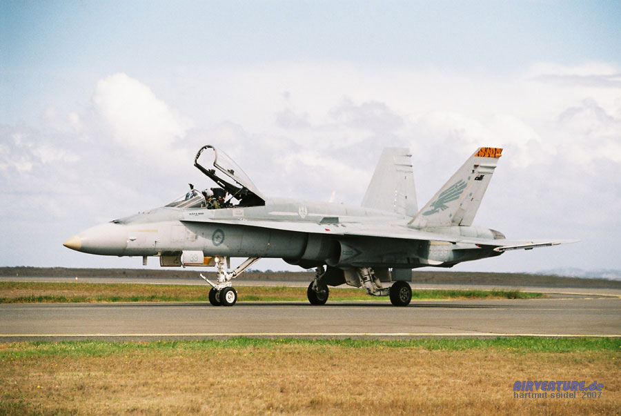 Im Flugprogramm der Australian International Airshow 2007 gab es mehrere unterschiedliche Vorführungen mit Kampfflugzeugen vom Typ McDonnell Douglas F/A-18 Hornet der Royal Australian Air Force ( RAAF ) zu sehen. Solo-Displays wurden hierbei von Flight Lieutenant Aaron Ward mit dieser Maschine gezeigt. |