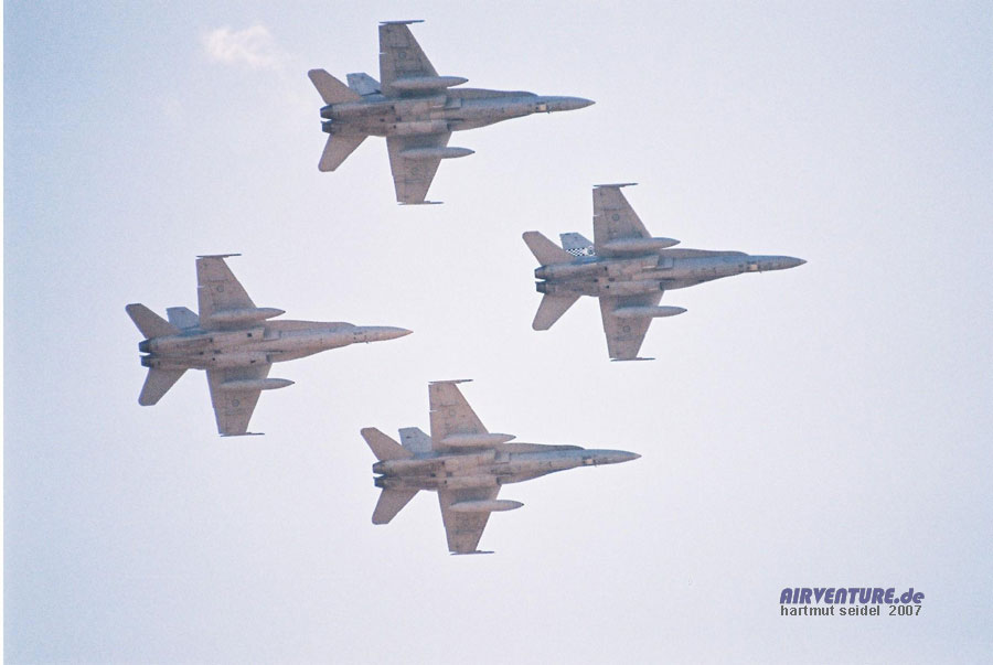 Zusätzlich zu den Hornet Solo-Displays von Flight Lieutenant Aaron Ward wurden im Flugprogramm der Australian International Airshow 2007 von der RAAF auch Hornet-Flugvorführungen in Viererformation gezeigt. |