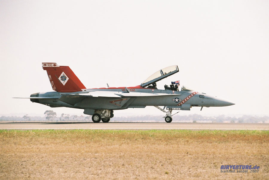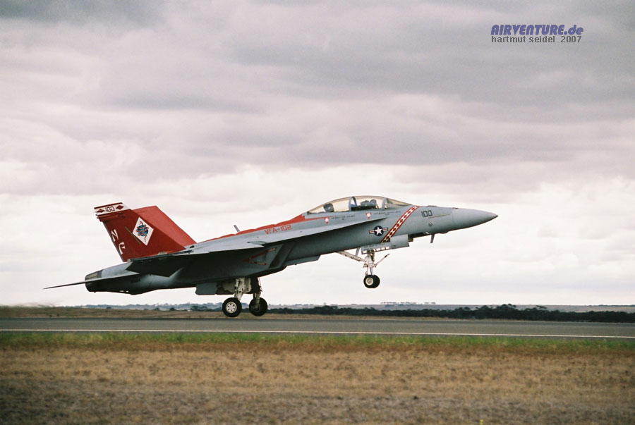 Hier startet gerade Ricardo Traven, der F/A-18 Chef-Testpilot der Firma Boeing, mit einer F/A-18 F Super Hornet der United States Navy zu einer seiner eindrucksvollen Flugvorführungen während der Australian International Airshow 2007. Die Boeing F/A-18 F Super Hornet ist eine etwas größere und erheblich leistungsgesteigerte Weiterentwicklung der alten McDonnell Douglas F/A-18 Hornet. |