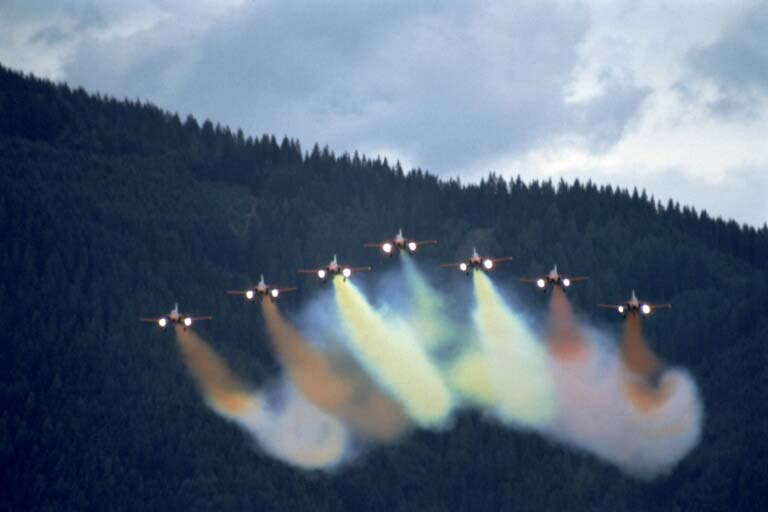 vier Maschinen der Patrouille Suisse in so enger Formation zusammen, daß eine Maschine
