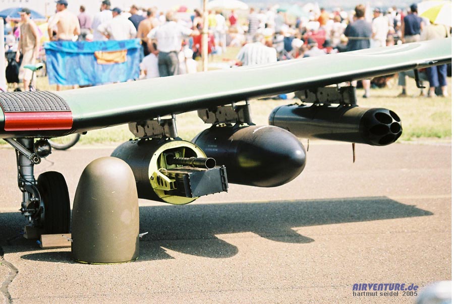 Maschinengewehrbehälten, sowie mit Abschußbehältern für ungelenkte Raketen bewaffnet
