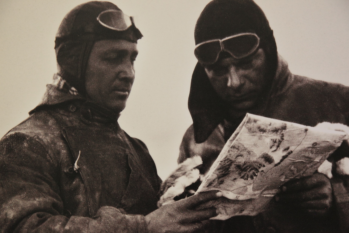 Gunther Plüschow (links) und sein Mechaniker und Begleiter Ernst Dreblow bei der Vorbereitung eines Erkundungsfluges über den Bergen Feuerlands.