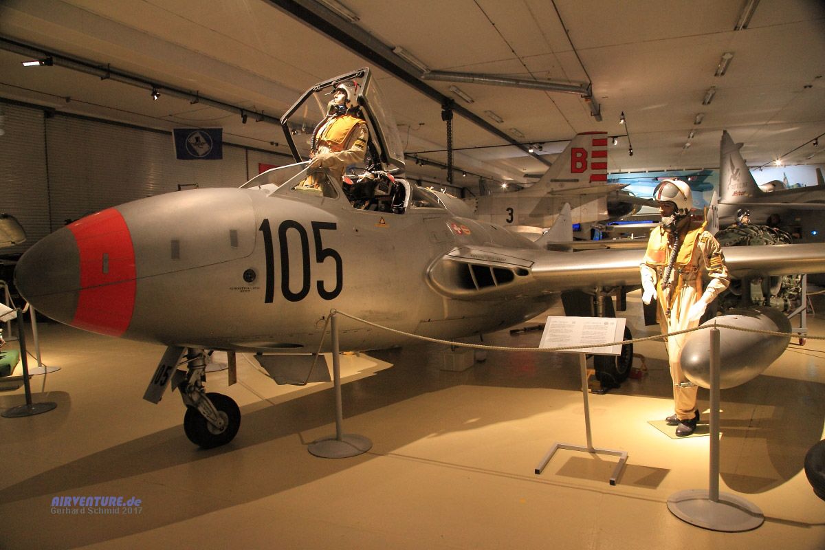 380 de Havilland Vampire wurden von Schweden angeschafft und unter der Bezeichnung J28 geführt. Die ausgestellte Maschine diente in der Schweiz, ging später an die Ljungbyhed Aeronautical Society, die sie bis 2013 in flugfähigem Zustand unterhielt. |