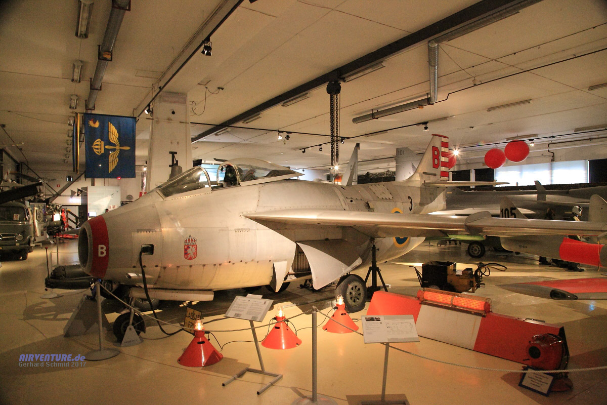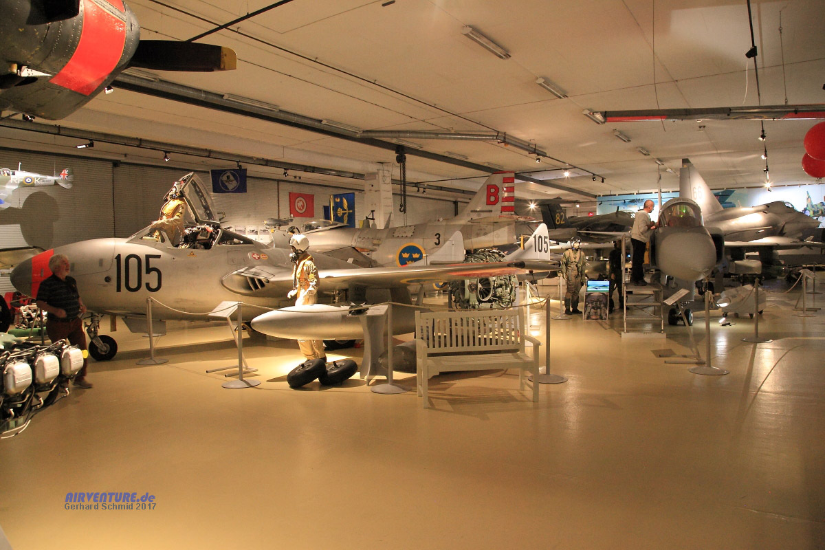 Weder die Besatzungen einer Vampire (links), noch der Pilot einer Gripen (rechs) muss den eisigen Fahrtwind fürchten. Der Besucher des Museum auch nicht. Aber letzterer bekommt eine interessante Zusammenfassung aus 100 Jahren schwedischer Militärluftfahrt geboten. |