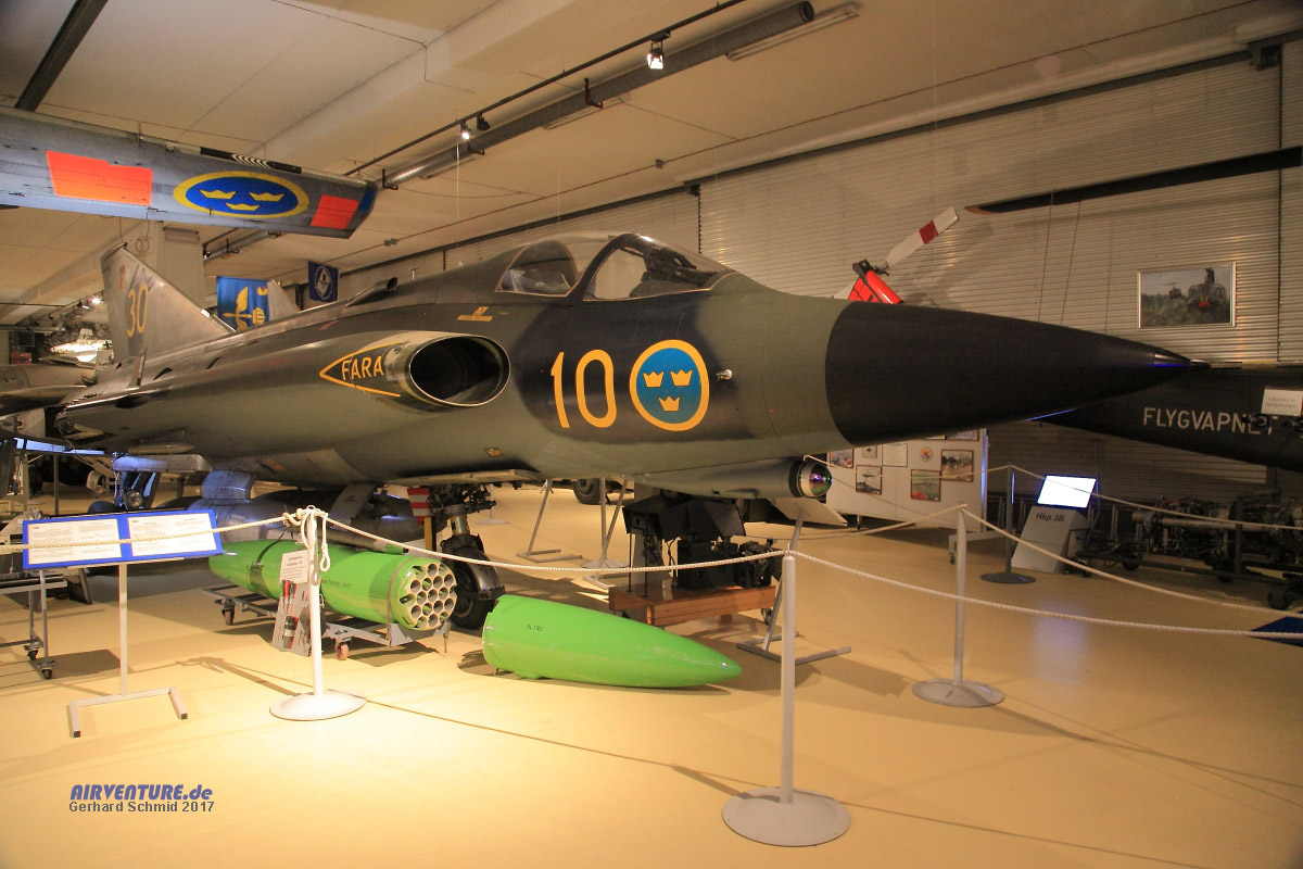 1955 lieferte Saab mit der J 35 Draken eine zukunftsweisende Konstruktion ab, bis 1974 wurden 615 Maschinen gebaut. 2005 musterte Österreich als letzter Betreiber der Draken seine Maschinen aus. |