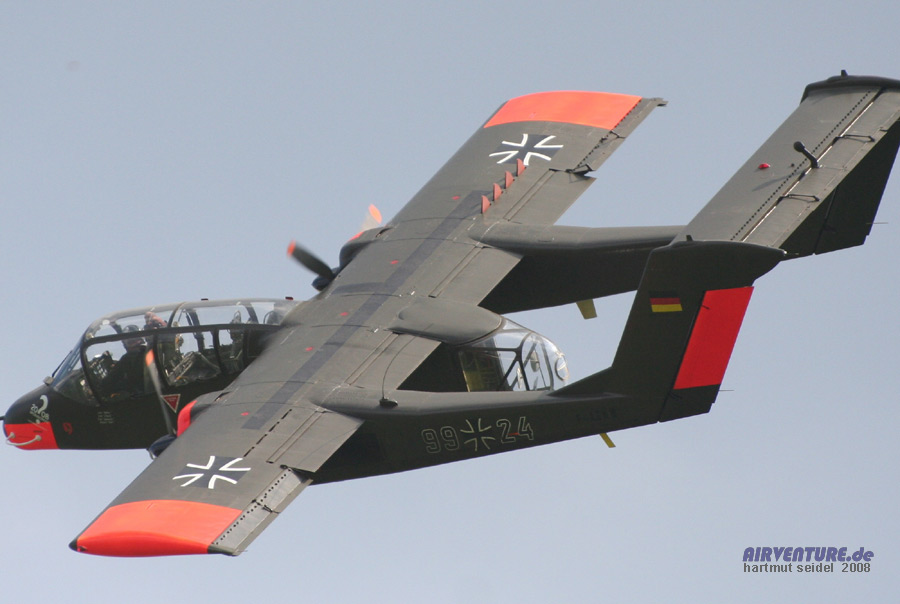 Ein weiterer sehr willkommender Airshowteilnehmer aus dem Ausland war diese Rockwell OV-10 Bronco, die aus Montélimar in Frankreich angereist war. Die Maschine wird schon seit längerer Zeit in Frankreich zivil betrieben, hat aber noch den Anstrich der deutschen Luftwaffe, bei der die Bronco bis 1990 eingesetzt worden ist. |