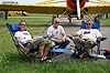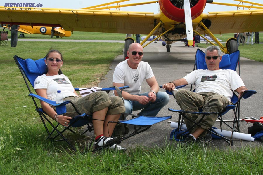 Dieses Foto zeigt nach erledigter Arbeit den Piloten der PZL 106 Kruk, Dieter Gehling ( rechts ) vor seiner Maschine sitzend, zusammen mit Astrid Gehling ( links ) und Gerhard Schmid ( Mitte ) von Airventure.de. |