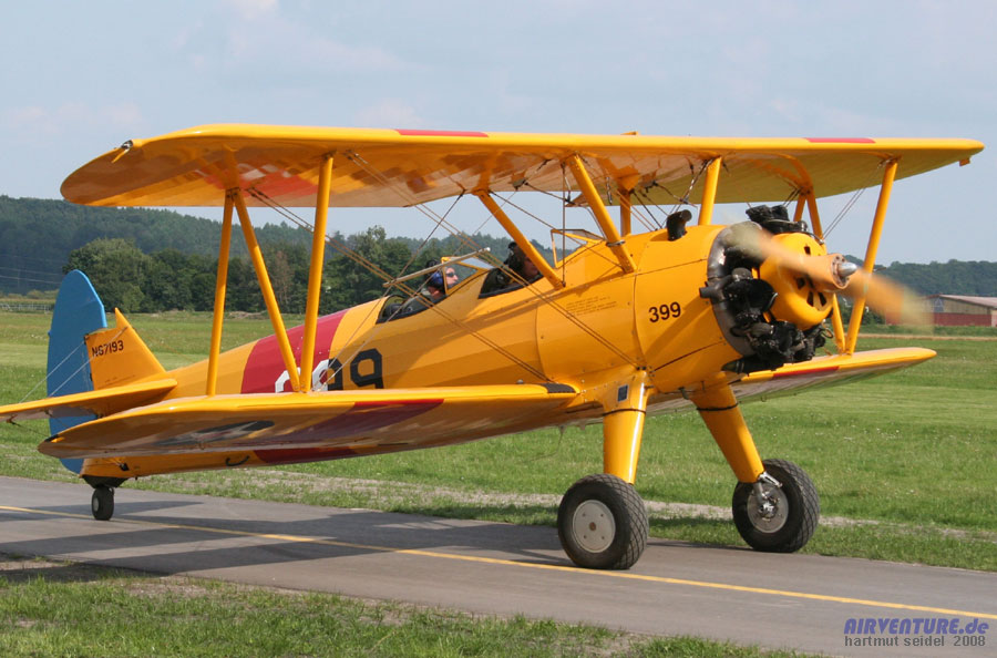Während der Augsburg Airshow 2008 gab es für die Besucher auch die Möglichkeit in offenen Doppeldeckern mitzufliegen. Hierfür standen zwei Maschinen zur Verfügung. Zum einen handelte es sich hierbei um diesen Boeing Stearman Doppeldecker von Georg Raab. |