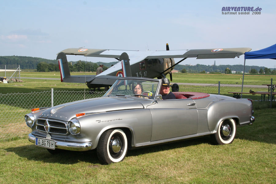 Im Static Display der Augsburg Airshow 2008 wurden auch einige historische Fahrzeuge des Oldtimer Club Augsburg ausgestellt. Dieses Foto zeigt eine gelungene Nostalgie Flugzeug- und Auto-Kombination : Die Max Holste Broussard von Bernd Axenbeck ( Baujahr 1960 ) zusammen mit einem Borgward Isabella Cabrio, Baujahr 1961. |