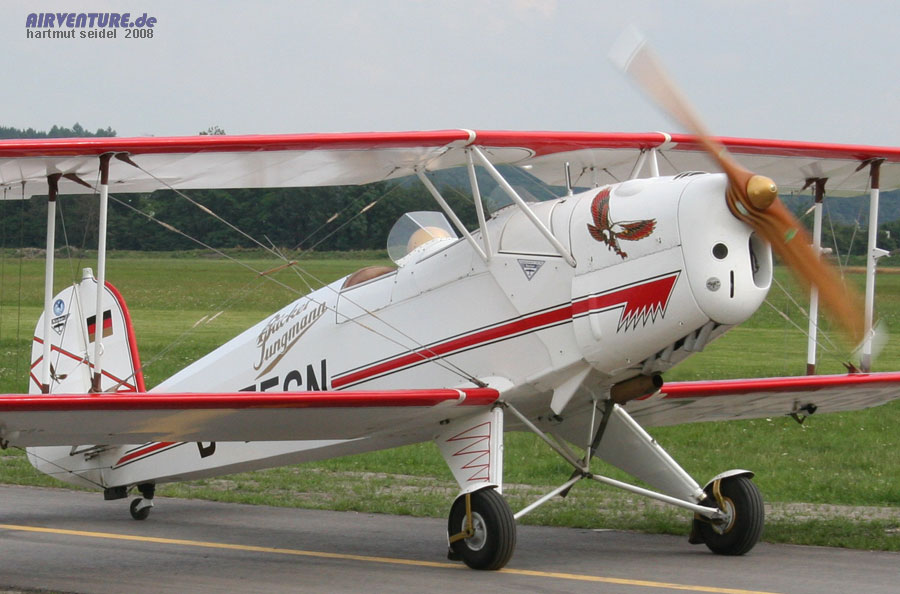 Bei dem zweiten offenen Doppeldecker im Rundflugbetrieb während der Augsburg Airshow 2008 handelte es sich um diese Maschine vom Typ Bücker Jungmann des ehemaligen Motorradrennfahrers Gert Bender. |