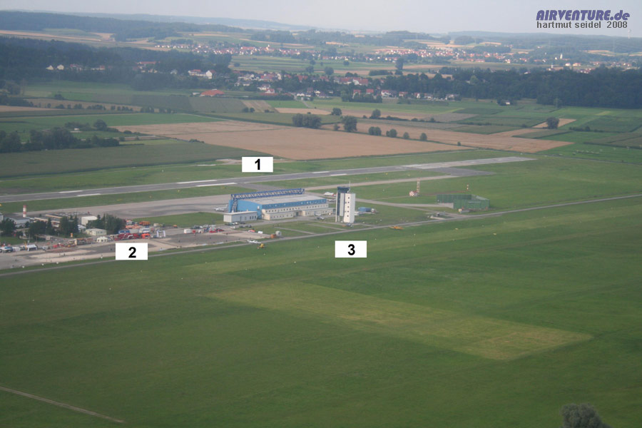 Diese Luftaufnahme zeigt den Flughafen Augsburg. Nördlich der Airport-Gebäude ist die über 1.200 Meter lange Asphalt Start- und Landebahn zu sehen ( 1 ). Das Veranstaltungsgelände der Augsburg Airshow 2008 ( 2 ) lag im Südteil des Flughafens und reichte bis zum Bereich des Flughafen-Towers. Die meisten Starts- und Landungen der Rundflugmaschinen, sowie der am Flugprogramm teilnehmenden Luftfahrzeuge fanden auf der Graspiste südlich des Towers ( 3 ) statt und waren daher für das Publikum gut zu sehen. Der Flughafen Augsburg feiert übrigens im Jahre 2008 sein 40jähriges Bestehen. |