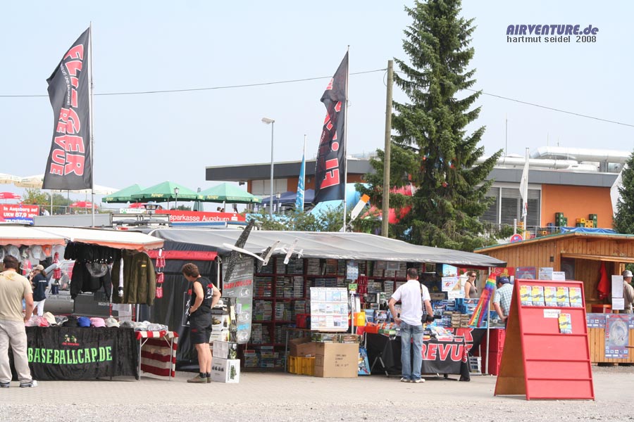 Die Augsburg Airshow 2008 war eine familienfreundliche Großveranstaltung, die zusätzlich zu dem interessanten Flugprogramm und den vielfältigen Rundflugmöglichkeiten auch noch einiges mehr geboten hat, um den luftfahrtinteressierten Besuchern einen ganztägigen schönen Aufenthalt zu ermöglichen. Hierzu gehörten natürlich auch viele Verpflegungsstände, die für das leibliche Wohl gesorgt haben, sowie auch etliche Verkaufsstände, an denen man unterschiedlichste Waren mit fliegerischem Bezug erwerben konnte. Auch Vergnügungsmöglichkeiten für Kinder gab es vor Ort. |