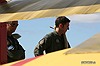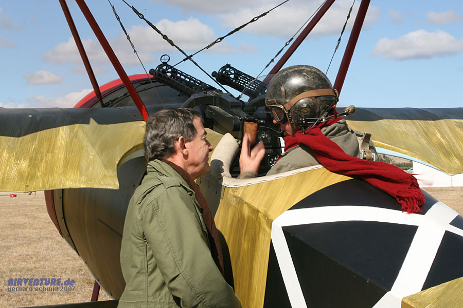 John Lanham, der bei den Flugvorführungen im Cockpit des roten Dreideckers in die Rolle des Manfred von Richthofen schlüpft, unterhält sich mit einem seiner "Jasta 11-Kameraden". Der Motor der Dr.I läuft bereits. |