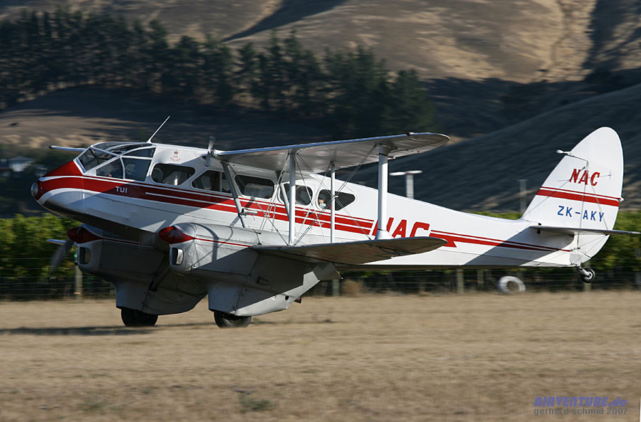 Der Name "TUI" unter dem Cockpit dieser De Havilland DH 89 "Dominie" in den Farben der NZ National Airways Corporation stammt von einem Neuseeländischen Vogel. Die DH 89 gehört dem Croydon Aviation Heritage Trust. |