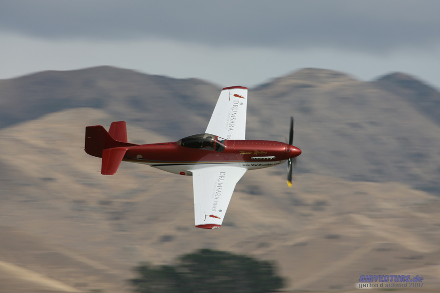 Die Thundermustang ist eine verkleinerte P-51, die von John Parker am Stead Airport in Reno, Nevada, USA vorgefertigt und dann als Bausatz verkauft wird. Mit ihrem 640 PS starken Falconer V-12 Motor ist die Thunder Mustang ein echter Hot Rod, worüber die Kiwi Thunder Group keinen Zweifel aufkommen ließ. |