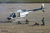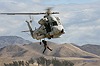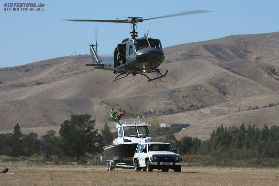Auch die UH-1 Crew hat eine Rettungsdemo im Programm. Und weil weit und breit kein Wasser verfügbar ist, wird die Seenot-Rettung mit einem auf dem Trailer gezogenen Boot dargestellt... |