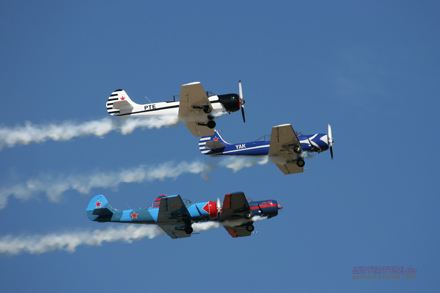 An Formationsvoführungen war kein Mangel bei der Classic Fighters Airshow. Vor allem die Yak-52 (Bild) und CJ-6A Trainer waren zahlreich vertreten und stellten bei "Tora! Tora! Tora!" die japanischen Angreifer dar. |