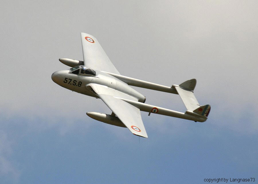 Die D.H 100 Vampire ist ein Strahljäger der ersten Generation und wurde zu Ende des zweiten Weltkriegs einsatzbereit. Besonders interessant ist die Mischbauweise in Holz und Metall, sowie die Auslegung als ungepfeilter Mitteldecker mit doppeltem Leitwerksträger. Etwa 4.400 Einheiten wurden für zahlreiche Nutzerstaaten produziert.