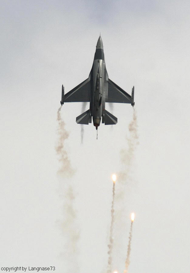 Eines der dynamischsten europäischen Solodisplays stellt das "F-16 Solo Display Team" der Holländischen Luftwaffe. Leider bekamen wir das Display zu Anfang der Show nur von außerhalb des Platzes mit. Hier sieht man die Displaymaschine bei ihrer "Abreise" am frühen Nachmittag. Auch dank der wunderschönen Lackierung, der Rauchanlage und dem Einsatz von Flares gehört sie zu den Highlights jeder Airshow in ihrem Terminkalender.