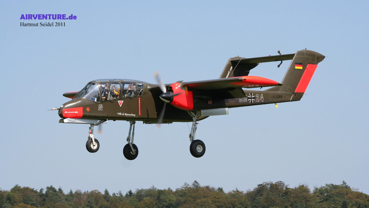 Während Kampfjets und große Verkehrsflugzeuge von ausserhalb zu ihren Vorführungen bei den Dittinger Flugtagen 2011 heranfliegen mussten, gab es auch einige Flächenflugzeuge der "Heavy Metal"-Kategorie, die problemlos von der kurzen Graspiste des Flugplatzes Dittingen aus operieren konnten. Hier landet gerade Alain Bes nach einer eindrucksvollen Flugvorführung mit der Rockwell OV-10 Bronco. |