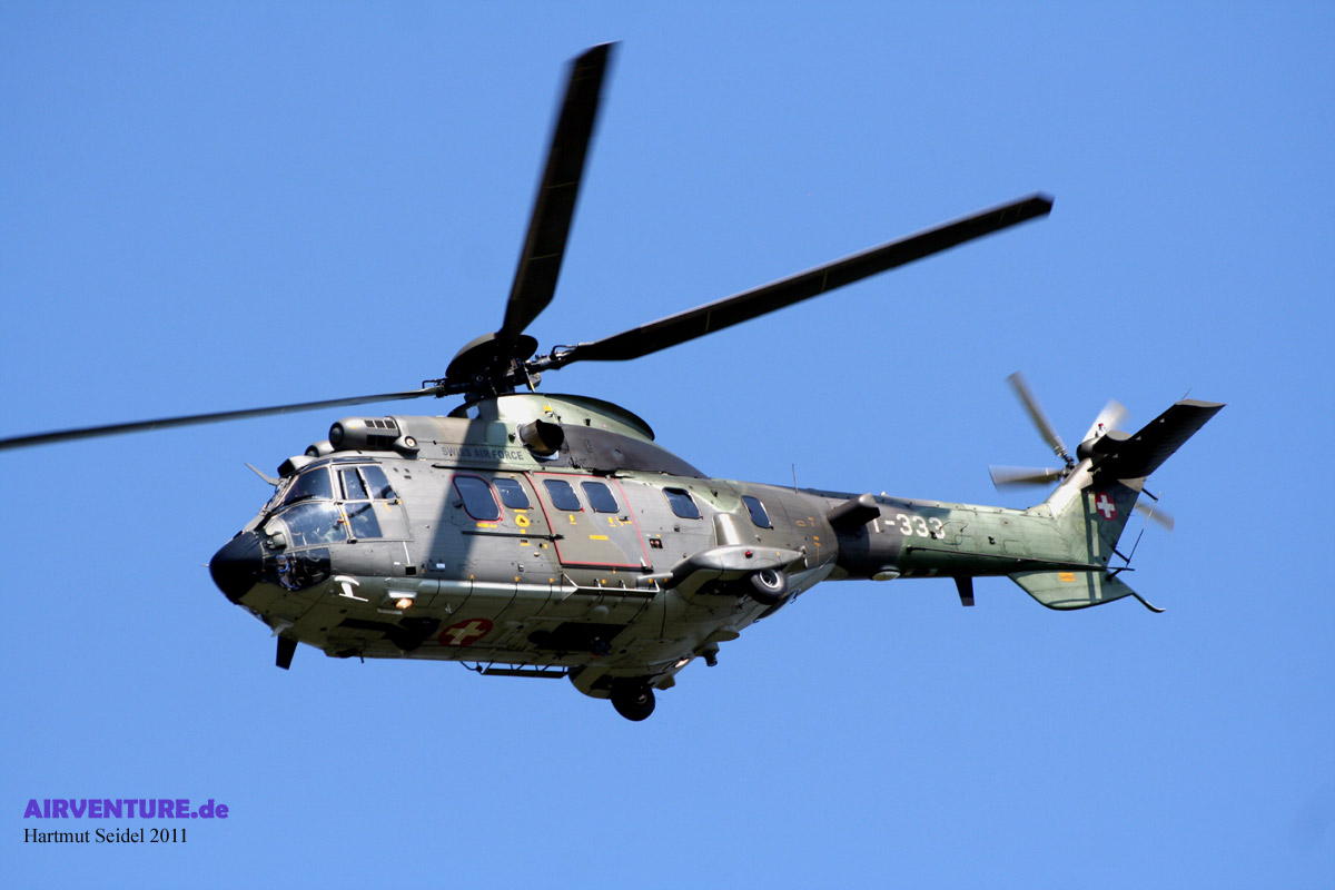 Bei dem von Major Willi Simic und Hauptmann Daniel Fausch für das Super Puma Solo-Display benutzten Hubschrauber handelte es sich genau gesagt um einen Eurocopter AS 532 Cougar, einer speziellen Militärversion des Super Puma, wobei man allerdings beide zumindest auf den ersten Blick nicht voneinander unterscheiden kann. |