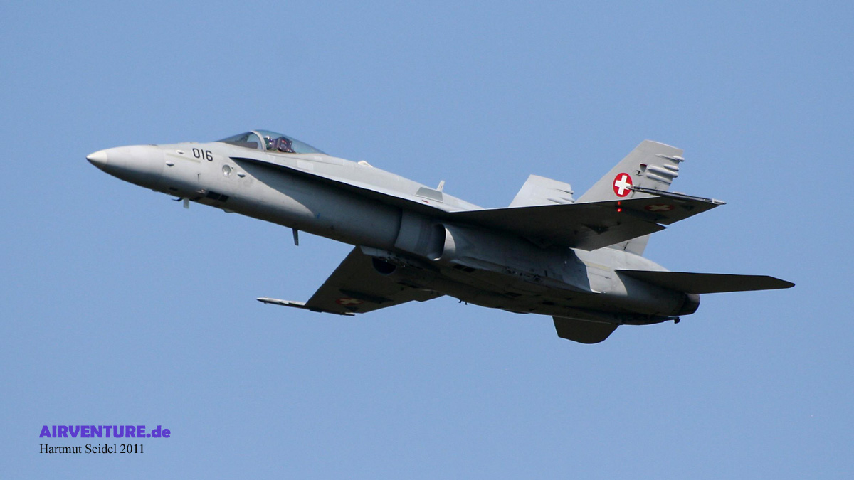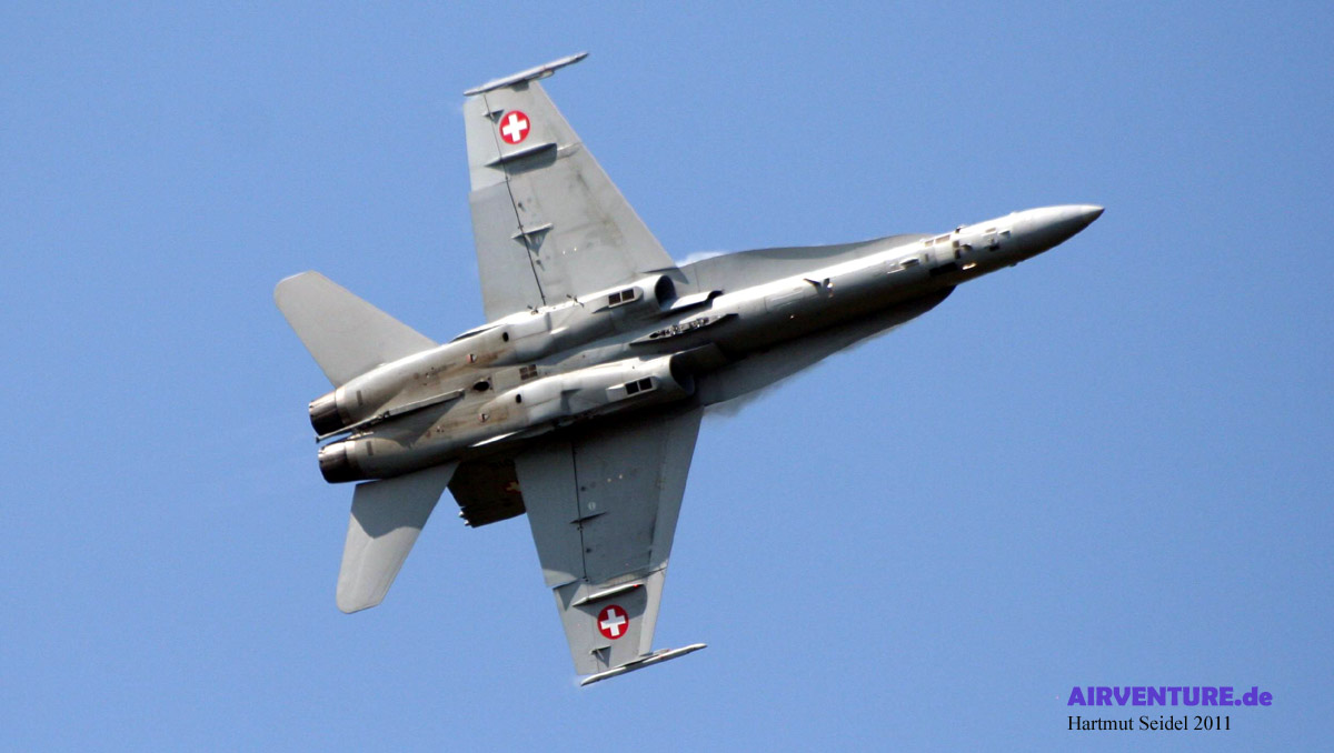 Zusätzlich zu den in Teil 1 dieses Berichts bereits gezeigten Formationskunstflug-Vorführungen gab es im Flugprogramm der Dittinger Flugtage 2011 auch eine Vielzahl von Solo-Displays mit interessanten Maschinen der unterschiedlichsten Größenordnungen zu sehen. Hier in Teil 2 geht es um die Einzelvorführungen mit großen und schweren Maschinen ( im weiteren Verlauf "Heavy Metal" genannt ). Eine besonders rasante "Heavy Metal"-Vorführung zeigte hierbei die Schweizer Luftwaffe mit dem Solo-Display dieser McDonnell Douglas F/A-18 Hornet. |