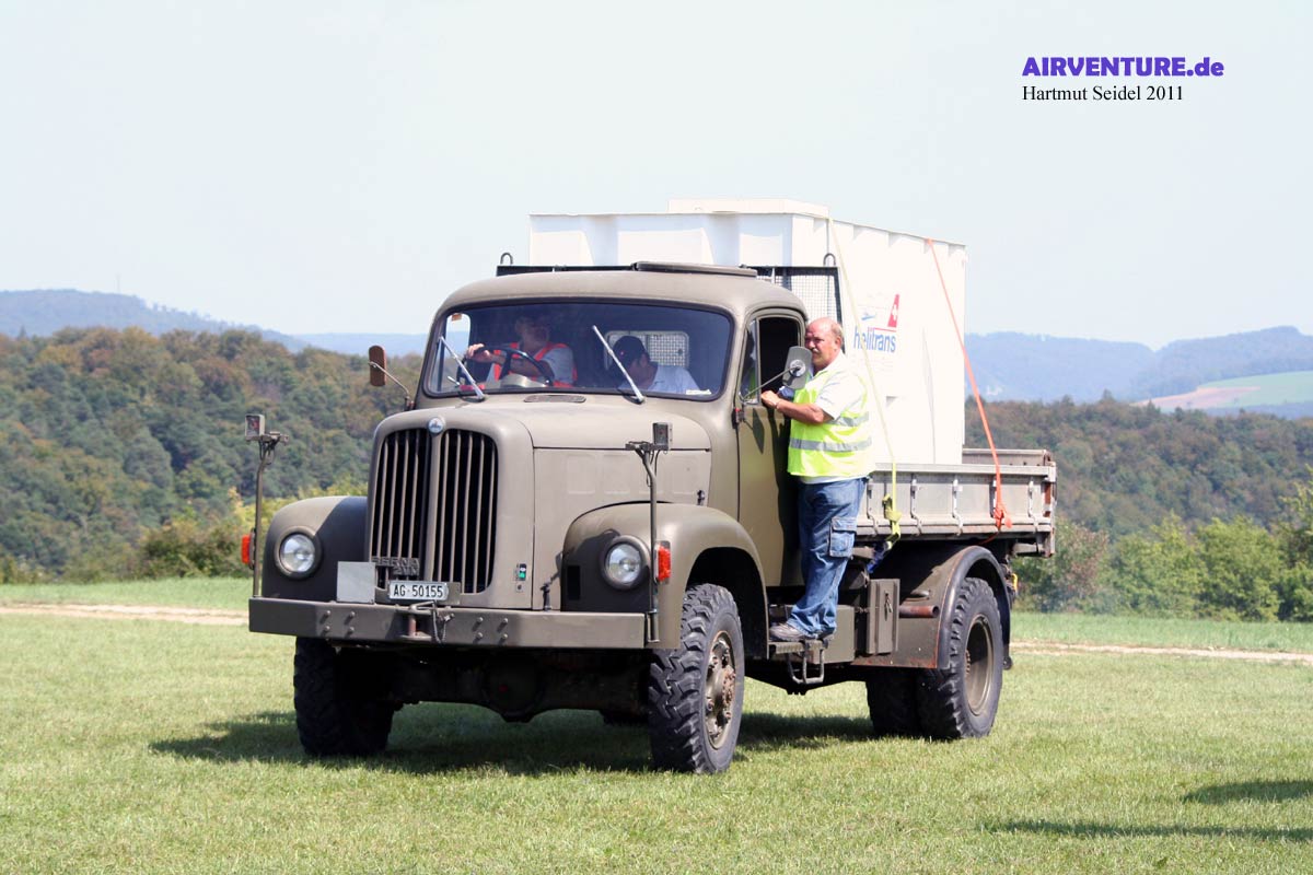 Auch unter den Fahrzeugen am Boden waren bei den Dittinger Flugtagen 2011 interessante Heavy Metal-Exemplare vertreten. Zum Beispiel dieser Lastwagen vom schweizerischen Typ Berna 2 VM, der mit einem auf der Ladefläche befestigten Spezialbehälter als Tankwagen im Einsatz war. |