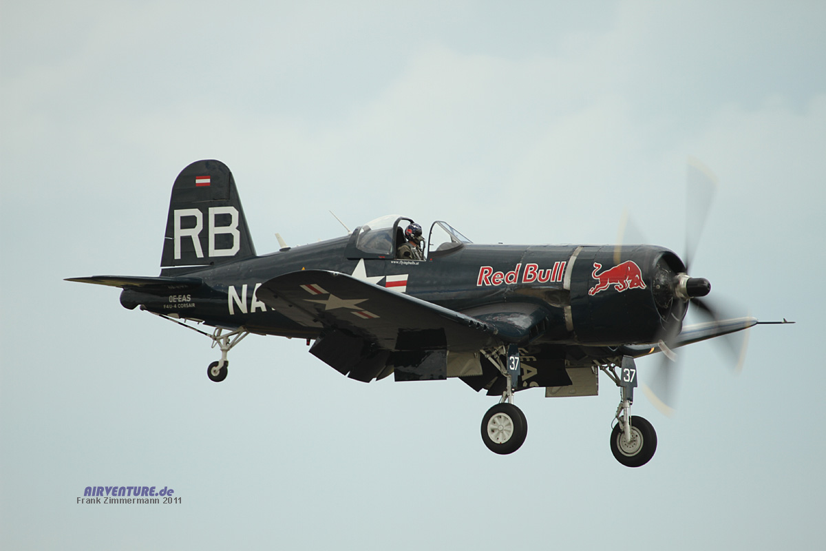 Aus Salzburg angereist bzw. eingeflogen war die F4U-4 Corsair der Flying Bulls. Wenn die FG-1D der TFC auch noch mit teilgenommen hätte, wäre eine schöne Dreier- Formation von Corsairs zusammengekommen . |
