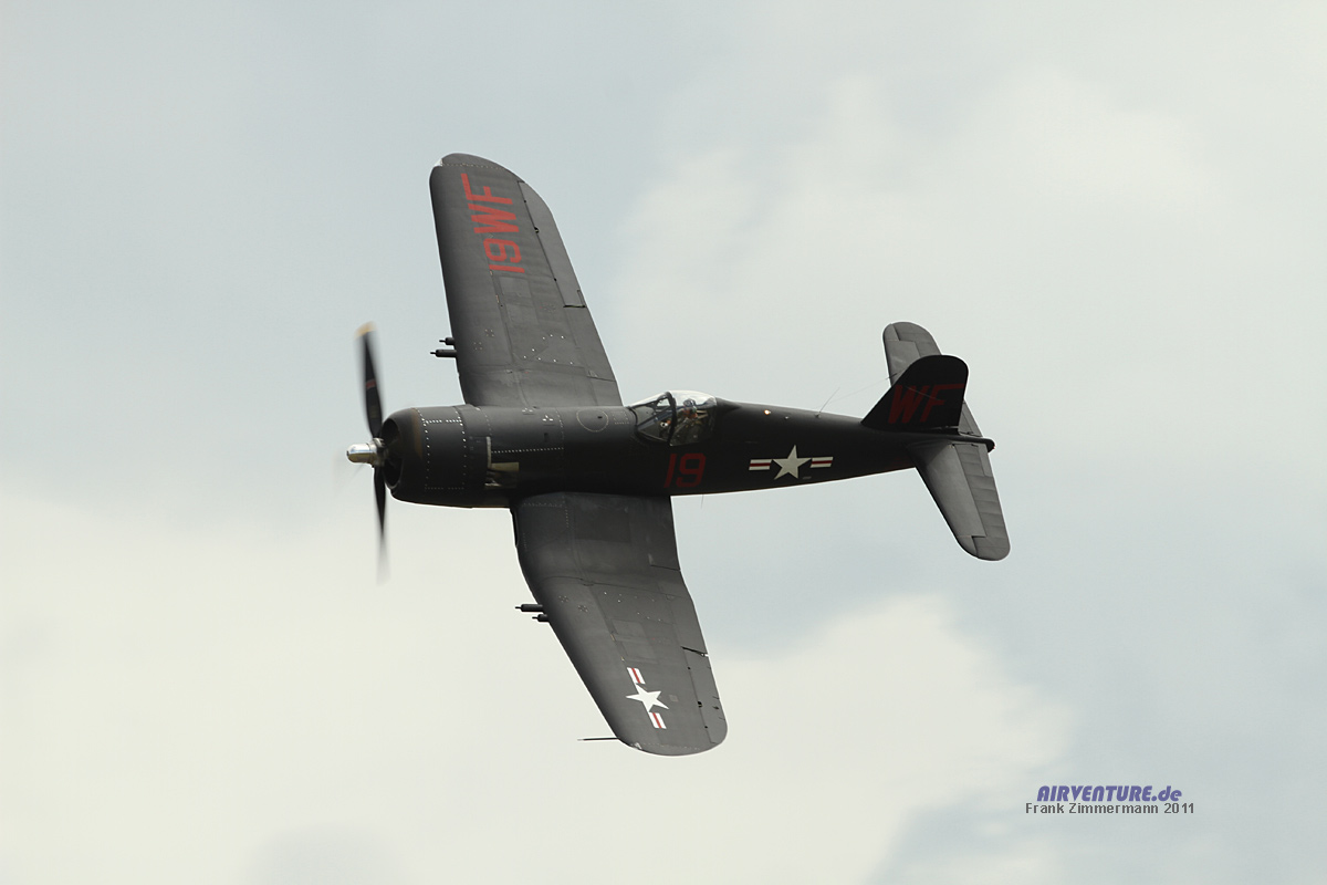 Wie einige Warbirds, die neuerdings aus Deutschland zur Show nach Duxford kommen, so auch die F4U-7 der Max Alpha Aviation. Sie wurde lackiert in den Farben eines Nachtjagdgeschwaders. Bryan Smith pilotierte die Maschine während der Airshow . |