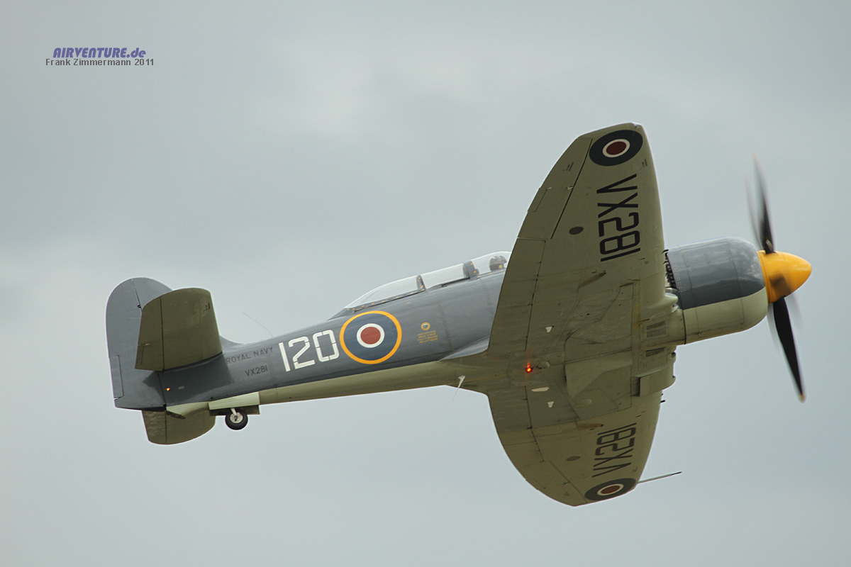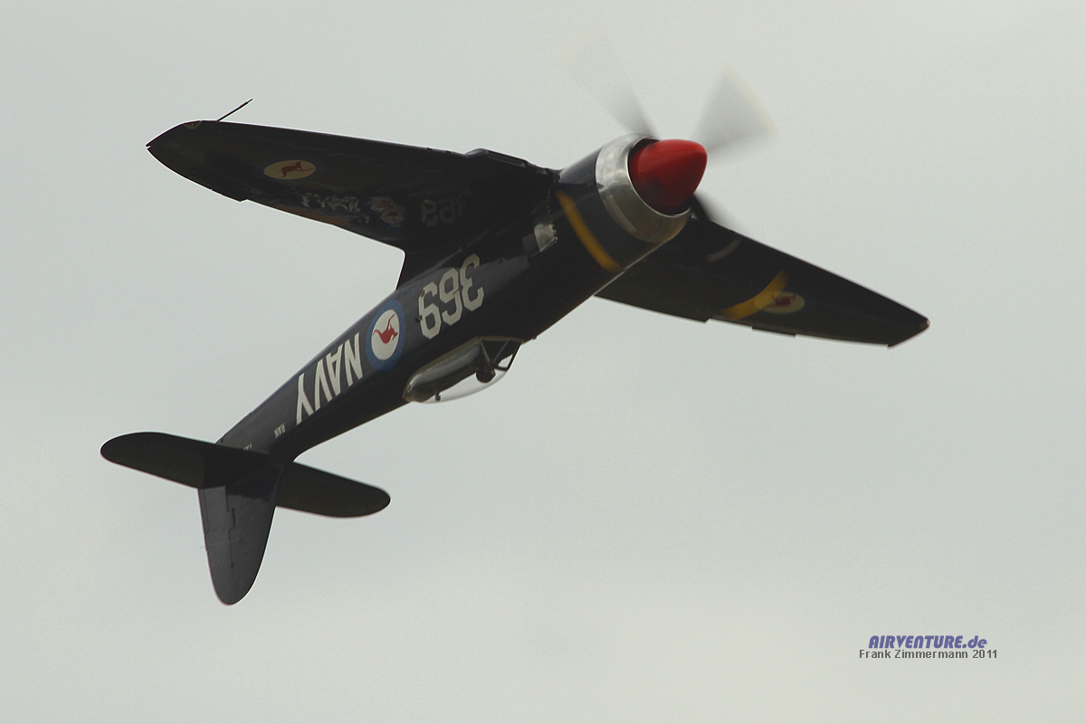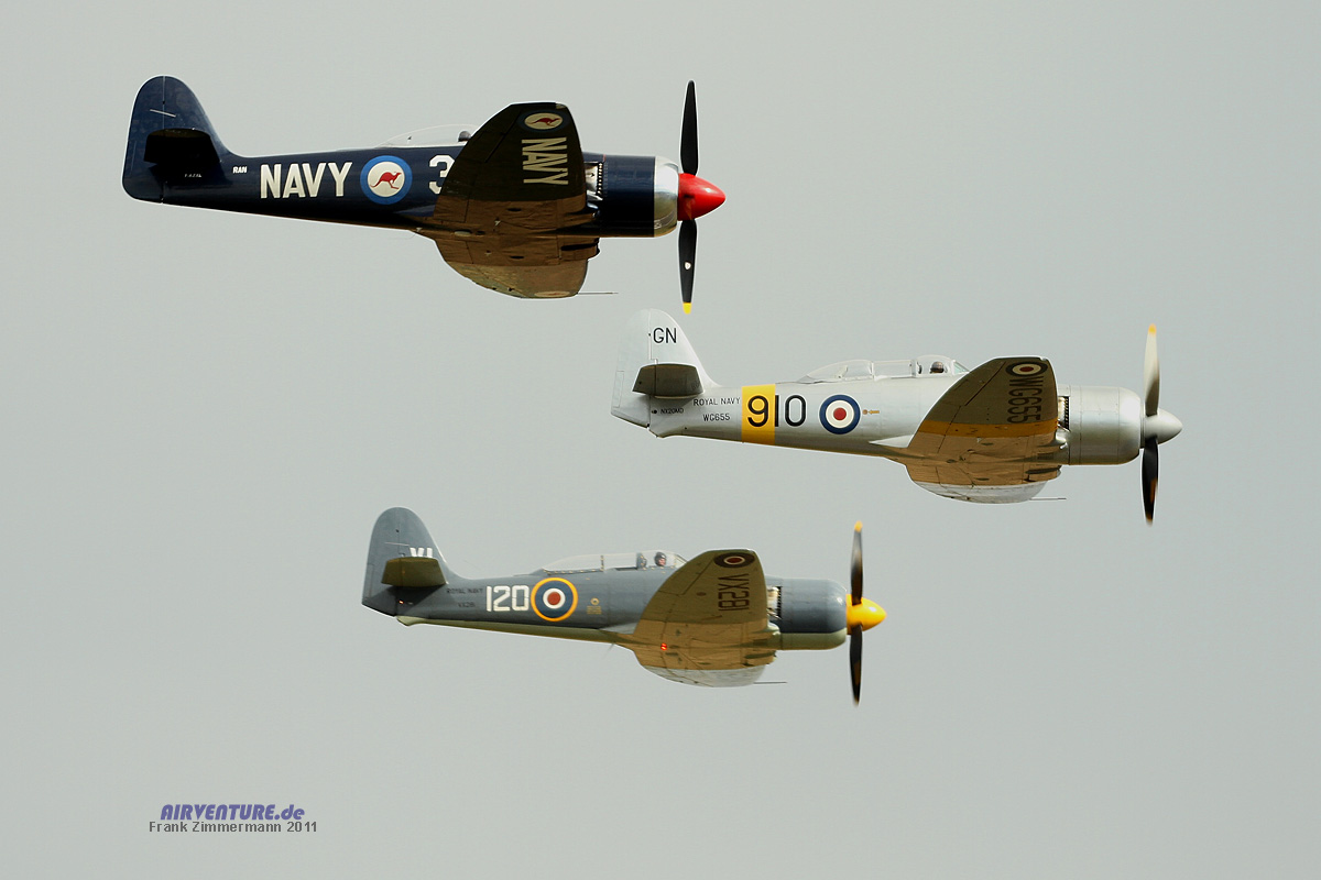 Die Hawker Sea Fury zählt zu den eher seltenen Warbirds. Eine Formation von drei Maschinen ist daher nicht selbstverständlich. |