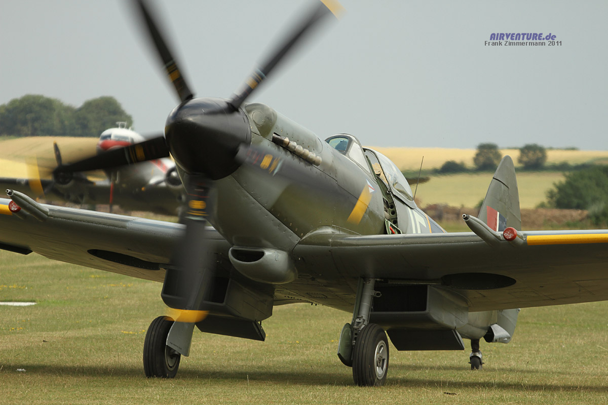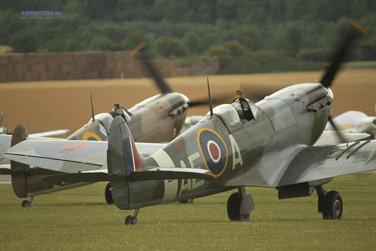 Wie gewöhnlich beginnen die Flying Legends mit dem Tailchase der Spitfires, diesmal waren 7 Spits dabei. Das Bild zeigt FR XIVe beim Taxiing. Sie ist eine von zwei Spitfires der TFC, die von dem leistungstärkeren Rolls Royce Griffon Triebwerk angetrieben werden. |