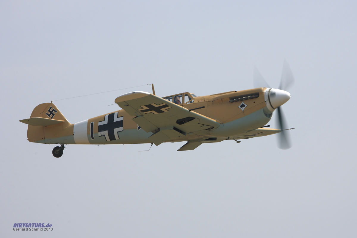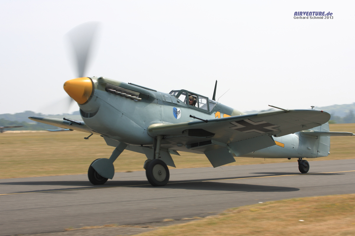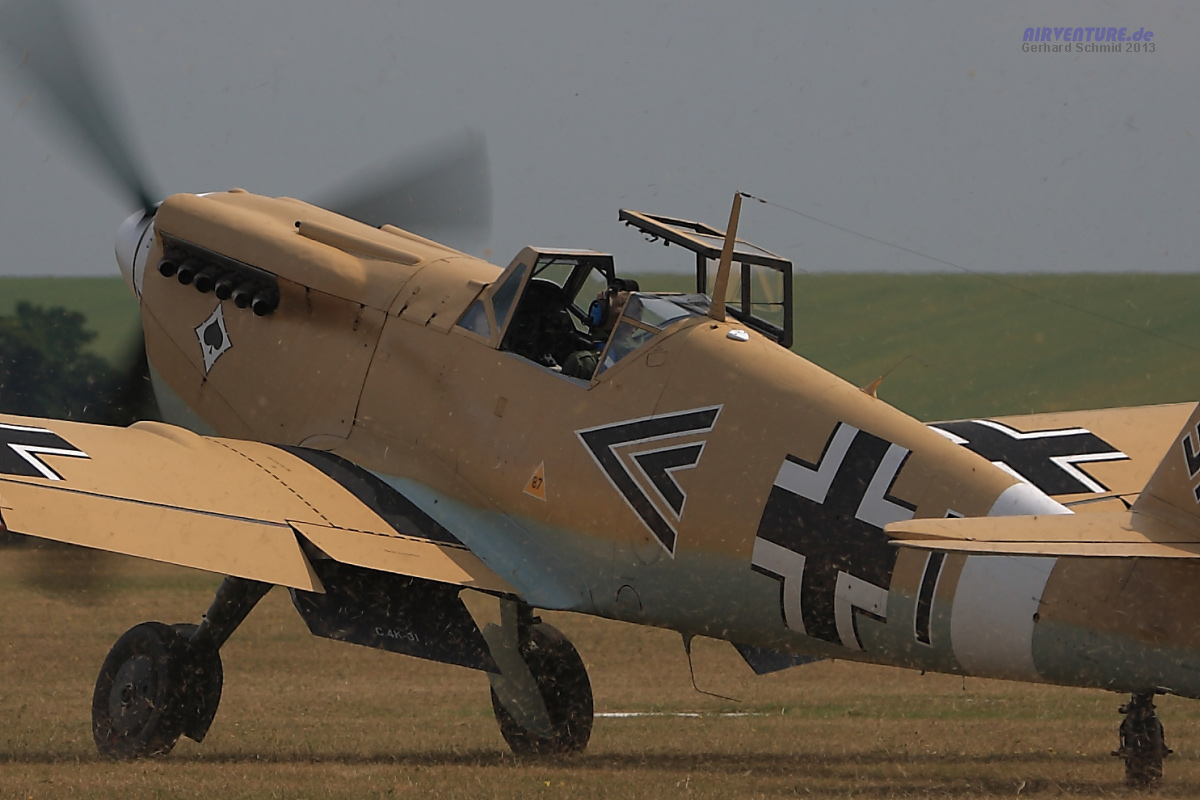 Am Ende der von 2008 bis 2010 erfolgten Restaurierung erhielt die Buchon von Richard Lake den Wüstenanstrich der Bf 109 von Major Erich Gerlitz, der 1942 als Kommandeur des III/JG 53 in Quotaifija, Ägypten, stationiert war. |