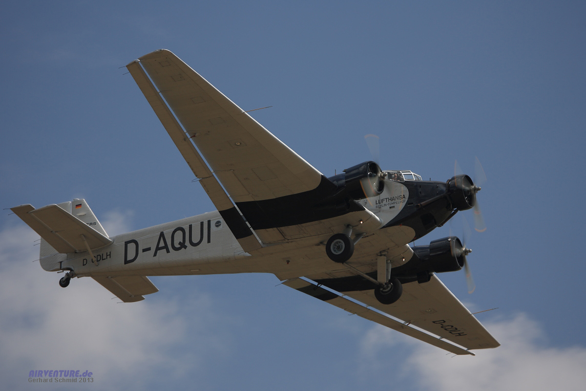 Seit 1984 befindet sich die unter dem historischen Kennzeichen D-AQUI bekannte Ju 52 im Besitz der Lufthansa. Etwa 10.000 Passagiere erleben jedes Jahr auf Strecken- und Rundflügen die Atmosphäre des Fliegens in den 30er Jahren. |
