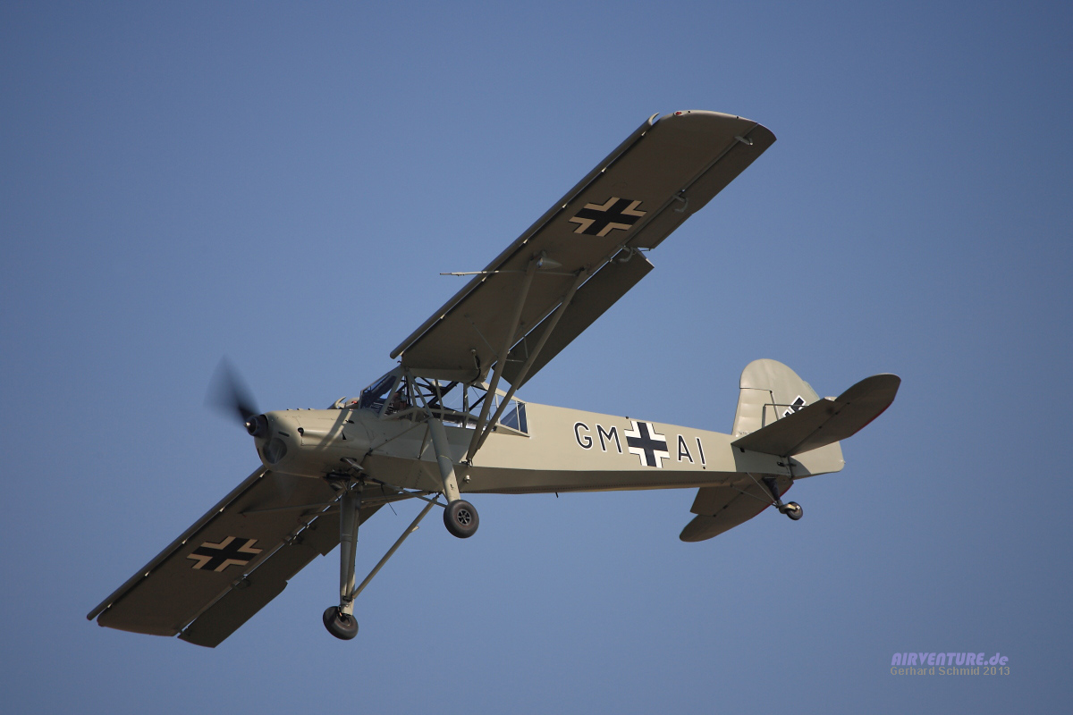 Jean Munn, Chefmechaniker der Shuttleworth Collection, flog die Fi-156A-1 Storch von Peter Holloway eindrucksvoll vor. Es ist einer der wenigen verbliebenen Original-Störche der A-Serie. |