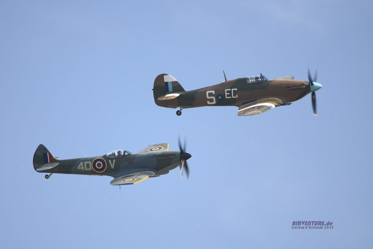 Zwei fliegende Legenden in Formation. Die Hurricane Mk IIc und die Spitfire Mk LF XVIE werden betrieben vom Battle of Britain Memorial Flight, der Abteilung "fliegendes Museum" der Royal Air Force. |