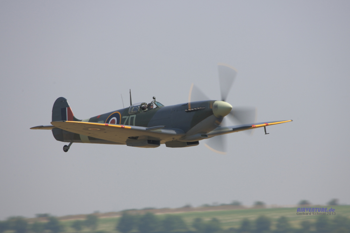 Diese Mk IXB Spitfire wird betrieben von der "Old Flying Machine Company". Sie war eine von sieben Supermarine Spitfires, die 2013 auf dem Duxford Airfield mitwirkten. |