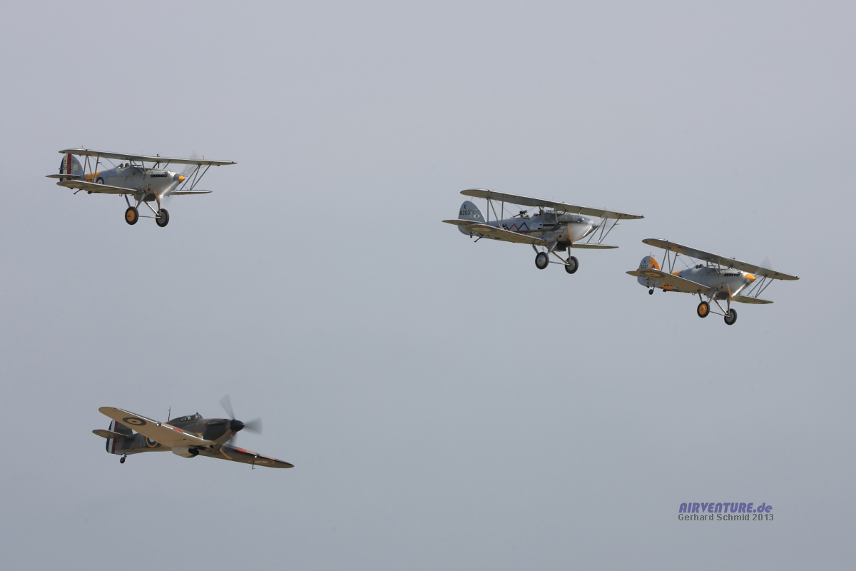 Die Hawker-Formation: Eine Demon, zwei Nimrod, begleitet von der Hurricane Mk. II des Battle of Britain Memorial Flight. Bei genauem Hinsehen fällt die sehr ähnliche Kunstruktion von Rumpf und Leitwerk auf. |